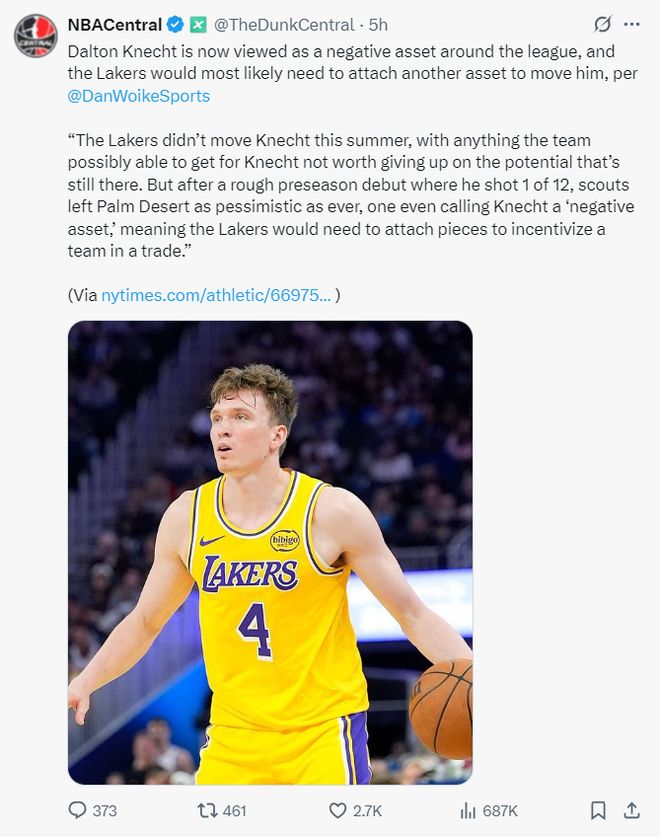 不过这其中存在一个难点,那就是克内克特已经不算是一个优质的资产,根据湖人记者丹沃尔克的报道,外界已经认为克内克特是一个负资产,如果要交易他需要添加更多资产。湖人今夏没有交易他就是因为很多球队将他看作负资产,加上夏季联赛、季前赛均发挥不佳,他的交易价值还在走低。
